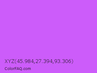 XYZ 45.984,27.394,93.306 Color is a light purple color and the nearest color is Heliotrope #df73ff. Hex code #cc5cfa and RGB value is rgb(204,92,250). In RGB color space, this color is composed of 80% red, 36% green, 98% blue, In CMYK color space, this color is composed of 18% cyan, 63% magenta, 0% yellow , 2% black , In HSL color space, this color has a hue angle of 283° , 94% saturation and 67% lightness.