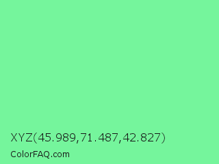 XYZ 45.989,71.487,42.827 Color is a light green color and the nearest color is Very Light Malachite Green #64e986. Hex code #75f59c and RGB value is rgb(117,245,156). In RGB color space, this color is composed of 46% red, 96% green, 61% blue, In CMYK color space, this color is composed of 52% cyan, 0% magenta, 36% yellow , 4% black , In HSL color space, this color has a hue angle of 138° , 86% saturation and 71% lightness.