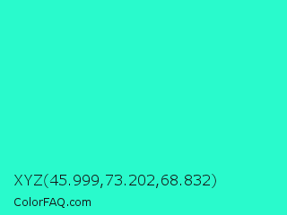 XYZ 45.999,73.202,68.832 Color is a normal cyan color and the nearest color is Turquoise #40e0d0. Hex code #29facc and RGB value is rgb(41,250,204). In RGB color space, this color is composed of 16% red, 98% green, 80% blue, In CMYK color space, this color is composed of 84% cyan, 0% magenta, 18% yellow , 2% black , In HSL color space, this color has a hue angle of 167° , 95% saturation and 57% lightness.
