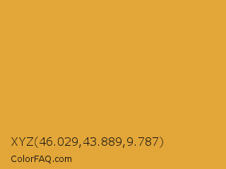 XYZ 46.029,43.889,9.787 Color is a normal orange color and the nearest color is Tulip Tree #eab33b. Hex code #e3a638 and RGB value is rgb(227,166,56). In RGB color space, this color is composed of 89% red, 65% green, 22% blue, In CMYK color space, this color is composed of 0% cyan, 27% magenta, 75% yellow , 11% black , In HSL color space, this color has a hue angle of 39° , 75% saturation and 55% lightness.