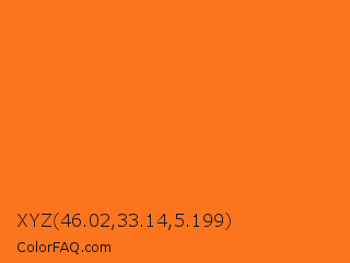 XYZ 46.02,33.14,5.199 Color is a normal orange color and the nearest color is Pumpkin #ff7518. Hex code #fa751e and RGB value is rgb(250,117,30). In RGB color space, this color is composed of 98% red, 46% green, 12% blue, In CMYK color space, this color is composed of 0% cyan, 53% magenta, 88% yellow , 2% black , In HSL color space, this color has a hue angle of 24° , 96% saturation and 55% lightness.