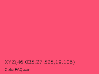 XYZ 46.035,27.525,19.106 Color is a light red color and the nearest color is Fiery Rose #ff5470. Hex code #fc4f73 and RGB value is rgb(252,79,115). In RGB color space, this color is composed of 99% red, 31% green, 45% blue, In CMYK color space, this color is composed of 0% cyan, 69% magenta, 54% yellow , 1% black , In HSL color space, this color has a hue angle of 348° , 97% saturation and 65% lightness.