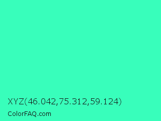 XYZ 46.042,75.312,59.124 Color is a light green color and the nearest color is Turquoise #40e0d0. Hex code #38febb and RGB value is rgb(56,254,187). In RGB color space, this color is composed of 22% red, 100% green, 73% blue, In CMYK color space, this color is composed of 78% cyan, 0% magenta, 26% yellow , 0% black , In HSL color space, this color has a hue angle of 160° , 99% saturation and 61% lightness.