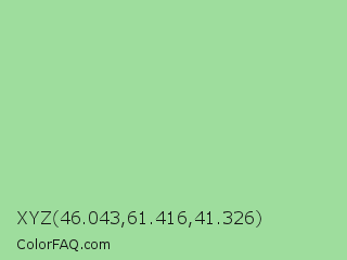 XYZ 46.043,61.416,41.326 Color is a light green color and the nearest color is Granny Smith Apple Crayola #9de093. Hex code #9edd9d and RGB value is rgb(158,221,157). In RGB color space, this color is composed of 62% red, 87% green, 62% blue, In CMYK color space, this color is composed of 29% cyan, 0% magenta, 29% yellow , 13% black , In HSL color space, this color has a hue angle of 119° , 48% saturation and 74% lightness.
