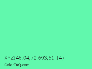 XYZ 46.04,72.693,51.14 Color is a light green color and the nearest color is Medium Aquamarine #66ddaa. Hex code #61f8ad and RGB value is rgb(97,248,173). In RGB color space, this color is composed of 38% red, 97% green, 68% blue, In CMYK color space, this color is composed of 61% cyan, 0% magenta, 30% yellow , 3% black , In HSL color space, this color has a hue angle of 150° , 92% saturation and 68% lightness.