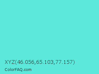 XYZ 46.056,65.103,77.157 Color is a light cyan color and the nearest color is Turquoise Blue #6cdae7. Hex code #5ce8db and RGB value is rgb(92,232,219). In RGB color space, this color is composed of 36% red, 91% green, 86% blue, In CMYK color space, this color is composed of 60% cyan, 0% magenta, 6% yellow , 9% black , In HSL color space, this color has a hue angle of 174° , 75% saturation and 64% lightness.