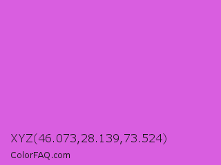 XYZ 46.073,28.139,73.524 Color is a light magenta color and the nearest color is Orchid #da70d6. Hex code #d95ee0 and RGB value is rgb(217,94,224). In RGB color space, this color is composed of 85% red, 37% green, 88% blue, In CMYK color space, this color is composed of 3% cyan, 58% magenta, 0% yellow , 12% black , In HSL color space, this color has a hue angle of 297° , 68% saturation and 62% lightness.