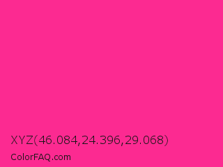 XYZ 46.084,24.396,29.068 Color is a normal rose color and the nearest color is Wild Strawberry Crayola #ff3399. Hex code #fc2a91 and RGB value is rgb(252,42,145). In RGB color space, this color is composed of 99% red, 16% green, 57% blue, In CMYK color space, this color is composed of 0% cyan, 83% magenta, 42% yellow , 1% black , In HSL color space, this color has a hue angle of 331° , 97% saturation and 58% lightness.