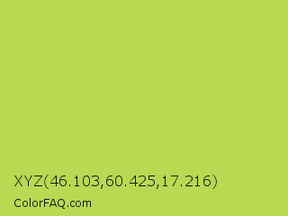 XYZ 46.103,60.425,17.216 Color is a normal lime color and the nearest color is June Bud #bdda57. Hex code #b8d952 and RGB value is rgb(184,217,82). In RGB color space, this color is composed of 72% red, 85% green, 32% blue, In CMYK color space, this color is composed of 15% cyan, 0% magenta, 62% yellow , 15% black , In HSL color space, this color has a hue angle of 75° , 64% saturation and 59% lightness.