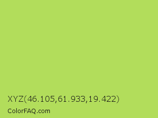 XYZ 46.105,61.933,19.422 Color is a light green color and the nearest color is June Bud #bdda57. Hex code #b2dd5b and RGB value is rgb(178,221,91). In RGB color space, this color is composed of 70% red, 87% green, 36% blue, In CMYK color space, this color is composed of 19% cyan, 0% magenta, 59% yellow , 13% black , In HSL color space, this color has a hue angle of 80° , 66% saturation and 61% lightness.