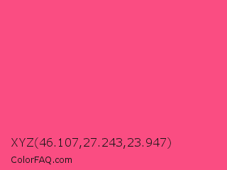 XYZ 46.107,27.243,23.947 Color is a light rose color and the nearest color is Sasquatch Socks #ff4681. Hex code #fa4d82 and RGB value is rgb(250,77,130). In RGB color space, this color is composed of 98% red, 30% green, 51% blue, In CMYK color space, this color is composed of 0% cyan, 69% magenta, 48% yellow , 2% black , In HSL color space, this color has a hue angle of 342° , 95% saturation and 64% lightness.