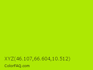 XYZ 46.107,66.604,10.512 Color is a normal lime color and the nearest color is Inch Worm #b0e313. Hex code #ade803 and RGB value is rgb(173,232,3). In RGB color space, this color is composed of 68% red, 91% green, 1% blue, In CMYK color space, this color is composed of 25% cyan, 0% magenta, 99% yellow , 9% black , In HSL color space, this color has a hue angle of 75° , 97% saturation and 46% lightness.