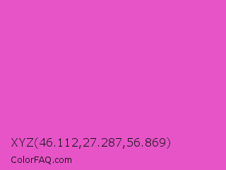 XYZ 46.112,27.287,56.869 Color is a light magenta color and the nearest color is Light Deep Pink #ff5ccd. Hex code #e654c7 and RGB value is rgb(230,84,199). In RGB color space, this color is composed of 90% red, 33% green, 78% blue, In CMYK color space, this color is composed of 0% cyan, 63% magenta, 13% yellow , 10% black , In HSL color space, this color has a hue angle of 313° , 74% saturation and 62% lightness.