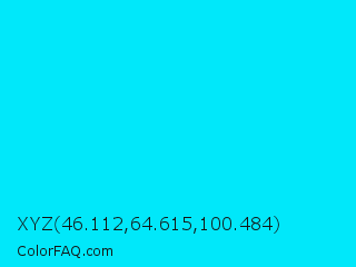 XYZ 46.112,64.615,100.484 Color is a normal cyan color and the nearest color is Loeen #15f2fd. Hex code #00e8fa and RGB value is rgb(0,232,250). In RGB color space, this color is composed of 0% red, 91% green, 98% blue, In CMYK color space, this color is composed of 100% cyan, 7% magenta, 0% yellow , 2% black , In HSL color space, this color has a hue angle of 184° , 100% saturation and 49% lightness.