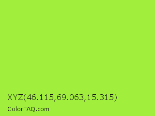 XYZ 46.115,69.063,15.315 Color is a normal green color and the nearest color is Green Lizard #a7f432. Hex code #a1ee3d and RGB value is rgb(161,238,61). In RGB color space, this color is composed of 63% red, 93% green, 24% blue, In CMYK color space, this color is composed of 32% cyan, 0% magenta, 74% yellow , 7% black , In HSL color space, this color has a hue angle of 86° , 84% saturation and 59% lightness.