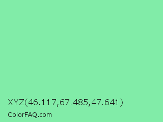 XYZ 46.117,67.485,47.641 Color is a light green color and the nearest color is Teal Deer #99e6b3. Hex code #81eca8 and RGB value is rgb(129,236,168). In RGB color space, this color is composed of 51% red, 93% green, 66% blue, In CMYK color space, this color is composed of 45% cyan, 0% magenta, 29% yellow , 7% black , In HSL color space, this color has a hue angle of 142° , 74% saturation and 72% lightness.