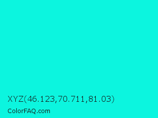 XYZ 46.123,70.711,81.03 Color is a normal cyan color and the nearest color is Bright Turquoise #08e8de. Hex code #0cf5df and RGB value is rgb(12,245,223). In RGB color space, this color is composed of 5% red, 96% green, 87% blue, In CMYK color space, this color is composed of 95% cyan, 0% magenta, 9% yellow , 4% black , In HSL color space, this color has a hue angle of 174° , 92% saturation and 50% lightness.