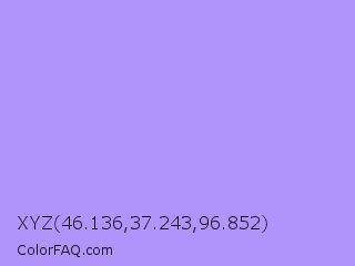 XYZ 46.136,37.243,96.852 Color is a light indigo color and the nearest color is Biloba Flower #b2a1ea. Hex code #b193fc and RGB value is rgb(177,147,252). In RGB color space, this color is composed of 69% red, 58% green, 99% blue, In CMYK color space, this color is composed of 30% cyan, 42% magenta, 0% yellow , 1% black , In HSL color space, this color has a hue angle of 257° , 95% saturation and 78% lightness.