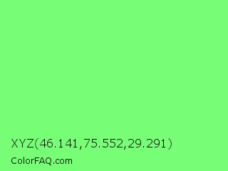 XYZ 46.141,75.552,29.291 Color is a light green color and the nearest color is Screamin Green #66ff66. Hex code #78fd76 and RGB value is rgb(120,253,118). In RGB color space, this color is composed of 47% red, 99% green, 46% blue, In CMYK color space, this color is composed of 53% cyan, 0% magenta, 53% yellow , 1% black , In HSL color space, this color has a hue angle of 119° , 97% saturation and 73% lightness.