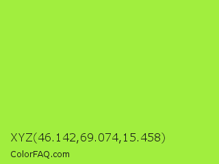 XYZ 46.142,69.074,15.458 Color is a normal green color and the nearest color is Green Lizard #a7f432. Hex code #a1ee3e and RGB value is rgb(161,238,62). In RGB color space, this color is composed of 63% red, 93% green, 24% blue, In CMYK color space, this color is composed of 32% cyan, 0% magenta, 74% yellow , 7% black , In HSL color space, this color has a hue angle of 86° , 84% saturation and 59% lightness.