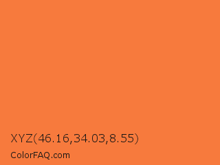 XYZ 46.16,34.03,8.55 Color is a normal orange color and the nearest color is Orange Crayola #ff7538. Hex code #f77a3d and RGB value is rgb(247,122,61). In RGB color space, this color is composed of 97% red, 48% green, 24% blue, In CMYK color space, this color is composed of 0% cyan, 51% magenta, 75% yellow , 3% black , In HSL color space, this color has a hue angle of 20° , 92% saturation and 60% lightness.