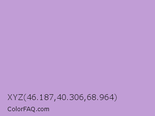 XYZ 46.187,40.306,68.964 Color is a light purple color and the nearest color is Light Wisteria #c9a0dc. Hex code #c19dd6 and RGB value is rgb(193,157,214). In RGB color space, this color is composed of 76% red, 62% green, 84% blue, In CMYK color space, this color is composed of 10% cyan, 27% magenta, 0% yellow , 16% black , In HSL color space, this color has a hue angle of 278° , 41% saturation and 73% lightness.
