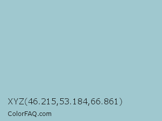 XYZ 46.215,53.184,66.861 Color is a light cyan color and the nearest color is Pastel Blue #aec6cf. Hex code #9fc8cf and RGB value is rgb(159,200,207). In RGB color space, this color is composed of 62% red, 78% green, 81% blue, In CMYK color space, this color is composed of 23% cyan, 3% magenta, 0% yellow , 19% black , In HSL color space, this color has a hue angle of 189° , 33% saturation and 72% lightness.