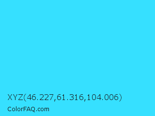 XYZ 46.227,61.316,104.006 Color is a light cyan color and the nearest color is Loeen #15f2fd. Hex code #36e0ff and RGB value is rgb(54,224,255). In RGB color space, this color is composed of 21% red, 88% green, 100% blue, In CMYK color space, this color is composed of 79% cyan, 12% magenta, 0% yellow , 0% black , In HSL color space, this color has a hue angle of 189° , 100% saturation and 61% lightness.