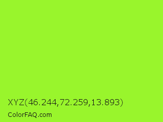 XYZ 46.244,72.259,13.893 Color is a normal green color and the nearest color is French Lime #9efd38. Hex code #99f52c and RGB value is rgb(153,245,44). In RGB color space, this color is composed of 60% red, 96% green, 17% blue, In CMYK color space, this color is composed of 38% cyan, 0% magenta, 82% yellow , 4% black , In HSL color space, this color has a hue angle of 87° , 91% saturation and 57% lightness.
