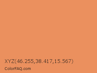 XYZ 46.255,38.417,15.567 Color is a light orange color and the nearest color is Big Foot Feet #e88e5a. Hex code #eb905e and RGB value is rgb(235,144,94). In RGB color space, this color is composed of 92% red, 56% green, 37% blue, In CMYK color space, this color is composed of 0% cyan, 39% magenta, 60% yellow , 8% black , In HSL color space, this color has a hue angle of 21° , 78% saturation and 65% lightness.