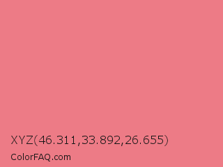 XYZ 46.311,33.892,26.655 Color is a light red color and the nearest color is Light Coral #f08080. Hex code #ed7b86 and RGB value is rgb(237,123,134). In RGB color space, this color is composed of 93% red, 48% green, 53% blue, In CMYK color space, this color is composed of 0% cyan, 48% magenta, 43% yellow , 7% black , In HSL color space, this color has a hue angle of 354° , 76% saturation and 71% lightness.