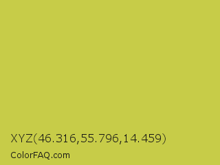 XYZ 46.316,55.796,14.459 Color is a normal yellow color and the nearest color is Turmeric #cabb48. Hex code #c7cc48 and RGB value is rgb(199,204,72). In RGB color space, this color is composed of 78% red, 80% green, 28% blue, In CMYK color space, this color is composed of 2% cyan, 0% magenta, 65% yellow , 20% black , In HSL color space, this color has a hue angle of 62° , 56% saturation and 54% lightness.