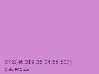 XYZ 46.319,36.24,65.527 Color is a light magenta color and the nearest color is Light Grayish Magenta #cc99cc. Hex code #ce8bd2 and RGB value is rgb(206,139,210). In RGB color space, this color is composed of 81% red, 55% green, 82% blue, In CMYK color space, this color is composed of 2% cyan, 34% magenta, 0% yellow , 18% black , In HSL color space, this color has a hue angle of 297° , 44% saturation and 68% lightness.