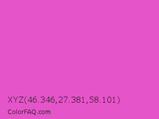XYZ 46.346,27.381,58.101 Color is a light magenta color and the nearest color is Light Deep Pink #ff5ccd. Hex code #e654c9 and RGB value is rgb(230,84,201). In RGB color space, this color is composed of 90% red, 33% green, 79% blue, In CMYK color space, this color is composed of 0% cyan, 63% magenta, 13% yellow , 10% black , In HSL color space, this color has a hue angle of 312° , 74% saturation and 62% lightness.