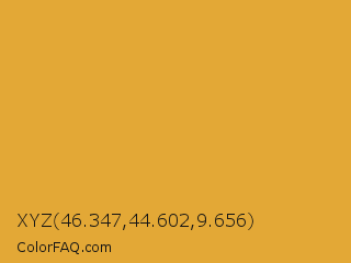 XYZ 46.347,44.602,9.656 Color is a normal orange color and the nearest color is Tulip Tree #eab33b. Hex code #e3a836 and RGB value is rgb(227,168,54). In RGB color space, this color is composed of 89% red, 66% green, 21% blue, In CMYK color space, this color is composed of 0% cyan, 26% magenta, 76% yellow , 11% black , In HSL color space, this color has a hue angle of 40° , 76% saturation and 55% lightness.