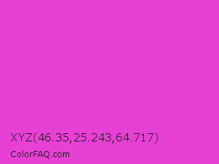 XYZ 46.35,25.243,64.717 Color is a normal magenta color and the nearest color is Purple Pizzazz #fe4eda. Hex code #e640d4 and RGB value is rgb(230,64,212). In RGB color space, this color is composed of 90% red, 25% green, 83% blue, In CMYK color space, this color is composed of 0% cyan, 72% magenta, 8% yellow , 10% black , In HSL color space, this color has a hue angle of 307° , 77% saturation and 58% lightness.