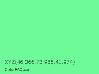 XYZ 46.366,73.986,41.974 Color is a light green color and the nearest color is Very Light Malachite Green #64e986. Hex code #6efa99 and RGB value is rgb(110,250,153). In RGB color space, this color is composed of 43% red, 98% green, 60% blue, In CMYK color space, this color is composed of 56% cyan, 0% magenta, 39% yellow , 2% black , In HSL color space, this color has a hue angle of 138° , 93% saturation and 71% lightness.