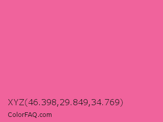 XYZ 46.398,29.849,34.769 Color is a light rose color and the nearest color is Light Crimson #f56991. Hex code #f0639c and RGB value is rgb(240,99,156). In RGB color space, this color is composed of 94% red, 39% green, 61% blue, In CMYK color space, this color is composed of 0% cyan, 59% magenta, 35% yellow , 6% black , In HSL color space, this color has a hue angle of 336° , 82% saturation and 66% lightness.