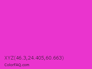 XYZ 46.3,24.405,60.663 Color is a normal magenta color and the nearest color is Razzle Dazzle Rose #ff33cc. Hex code #ea34ce and RGB value is rgb(234,52,206). In RGB color space, this color is composed of 92% red, 20% green, 81% blue, In CMYK color space, this color is composed of 0% cyan, 78% magenta, 12% yellow , 8% black , In HSL color space, this color has a hue angle of 309° , 81% saturation and 56% lightness.