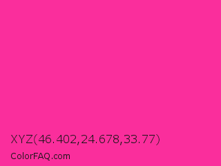 XYZ 46.402,24.678,33.77 Color is a normal rose color and the nearest color is Wild Strawberry Crayola #ff3399. Hex code #fa2e9c and RGB value is rgb(250,46,156). In RGB color space, this color is composed of 98% red, 18% green, 61% blue, In CMYK color space, this color is composed of 0% cyan, 82% magenta, 38% yellow , 2% black , In HSL color space, this color has a hue angle of 328° , 95% saturation and 58% lightness.