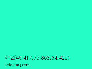 XYZ 46.417,75.863,64.421 Color is a normal cyan color and the nearest color is Bright Turquoise #08e8de. Hex code #23ffc4 and RGB value is rgb(35,255,196). In RGB color space, this color is composed of 14% red, 100% green, 77% blue, In CMYK color space, this color is composed of 86% cyan, 0% magenta, 23% yellow , 0% black , In HSL color space, this color has a hue angle of 164° , 100% saturation and 57% lightness.