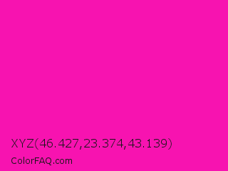 XYZ 46.427,23.374,43.139 Color is a normal magenta color and the nearest color is Shocking Pink #fc0fc0. Hex code #f713b0 and RGB value is rgb(247,19,176). In RGB color space, this color is composed of 97% red, 7% green, 69% blue, In CMYK color space, this color is composed of 0% cyan, 92% magenta, 29% yellow , 3% black , In HSL color space, this color has a hue angle of 319° , 93% saturation and 52% lightness.