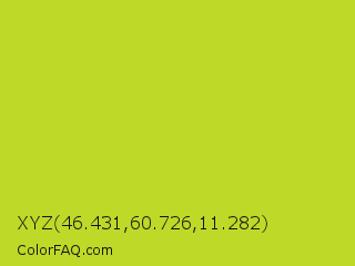 XYZ 46.431,60.726,11.282 Color is a normal yellow color and the nearest color is Key Lime Pie #bfc921. Hex code #bed928 and RGB value is rgb(190,217,40). In RGB color space, this color is composed of 75% red, 85% green, 16% blue, In CMYK color space, this color is composed of 12% cyan, 0% magenta, 82% yellow , 15% black , In HSL color space, this color has a hue angle of 69° , 70% saturation and 50% lightness.