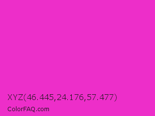 XYZ 46.445,24.176,57.477 Color is a normal magenta color and the nearest color is Razzle Dazzle Rose #ff33cc. Hex code #ed2ec9 and RGB value is rgb(237,46,201). In RGB color space, this color is composed of 93% red, 18% green, 79% blue, In CMYK color space, this color is composed of 0% cyan, 81% magenta, 15% yellow , 7% black , In HSL color space, this color has a hue angle of 311° , 84% saturation and 55% lightness.