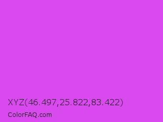 XYZ 46.497,25.822,83.422 Color is a light magenta color and the nearest color is Purple Pizzazz #fe4eda. Hex code #d94aee and RGB value is rgb(217,74,238). In RGB color space, this color is composed of 85% red, 29% green, 93% blue, In CMYK color space, this color is composed of 9% cyan, 69% magenta, 0% yellow , 7% black , In HSL color space, this color has a hue angle of 292° , 83% saturation and 61% lightness.