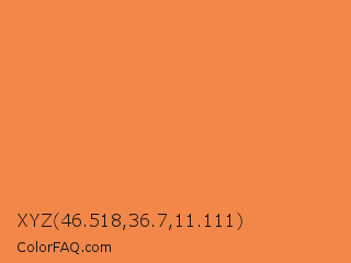 XYZ 46.518,36.7,11.111 Color is a light orange color and the nearest color is Jaffa #ef863f. Hex code #f2874a and RGB value is rgb(242,135,74). In RGB color space, this color is composed of 95% red, 53% green, 29% blue, In CMYK color space, this color is composed of 0% cyan, 44% magenta, 69% yellow , 5% black , In HSL color space, this color has a hue angle of 22° , 87% saturation and 62% lightness.