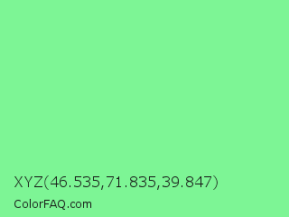 XYZ 46.535,71.835,39.847 Color is a light green color and the nearest color is Light Green #90ee90. Hex code #7df595 and RGB value is rgb(125,245,149). In RGB color space, this color is composed of 49% red, 96% green, 58% blue, In CMYK color space, this color is composed of 49% cyan, 0% magenta, 39% yellow , 4% black , In HSL color space, this color has a hue angle of 132° , 86% saturation and 73% lightness.