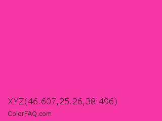 XYZ 46.607,25.26,38.496 Color is a normal magenta color and the nearest color is Rose Bonbon #f9429e. Hex code #f737a6 and RGB value is rgb(247,55,166). In RGB color space, this color is composed of 97% red, 22% green, 65% blue, In CMYK color space, this color is composed of 0% cyan, 78% magenta, 33% yellow , 3% black , In HSL color space, this color has a hue angle of 325° , 92% saturation and 59% lightness.