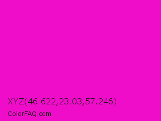XYZ 46.622,23.03,57.246 Color is a normal magenta color and the nearest color is Shocking Pink #fc0fc0. Hex code #f00dc9 and RGB value is rgb(240,13,201). In RGB color space, this color is composed of 94% red, 5% green, 79% blue, In CMYK color space, this color is composed of 0% cyan, 95% magenta, 16% yellow , 6% black , In HSL color space, this color has a hue angle of 310° , 90% saturation and 50% lightness.