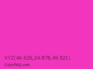 XYZ 46.626,24.878,49.921 Color is a normal magenta color and the nearest color is Razzle Dazzle Rose #ff33cc. Hex code #f135bc and RGB value is rgb(241,53,188). In RGB color space, this color is composed of 95% red, 21% green, 74% blue, In CMYK color space, this color is composed of 0% cyan, 78% magenta, 22% yellow , 5% black , In HSL color space, this color has a hue angle of 317° , 87% saturation and 58% lightness.